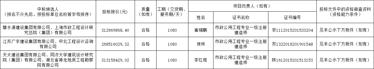 备注说明:中标候选人排名不分先后。江苏广宇建设集团有限公司和中北工程设计咨询有限公司联合体报价:费率98.18%;碧水源建设集团有限公司和上海市政工程设计研究总院(集团)有限公司联合体报价:费率99.40%;天太建设集团有限公司和同济大学建筑设计研究院(集团)有限公司和湖北省神龙地质工程勘察院有限公司联合体报价:费率99.57%。