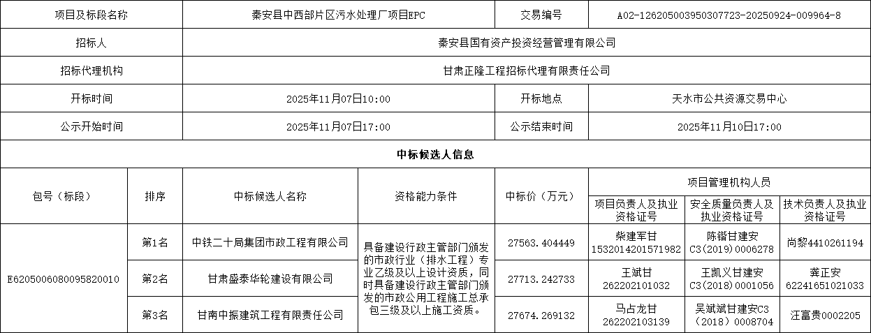 甘肃省秦安县中西部片区污水处理厂项目EPC中标候选人公示。