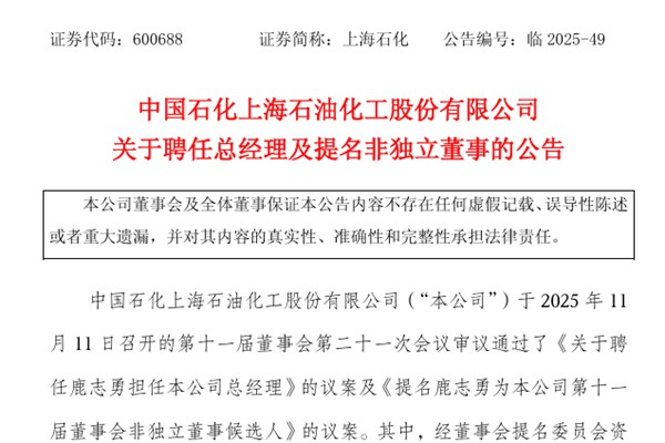 中国石化上海石油化工股份有限公司(下称:上海石化)公告称,公司于11月11日召开的第十一届董事会第二十一次会议审议通过了《关于聘任鹿志勇担任本公司总经理》的议案及《提名鹿志勇为本公司第十一届董事会非独立董事候选人》的议案。其中,经董事会提名委员会资格审查,董事会任命鹿志勇先生为本公司总经理,任期自2025年11月11日起至第十一届董事会届满之日止。提名鹿志勇先生任本公司第十一届董事会非独立董事的议案需提交本公司2025年第二次临时股东会审议。