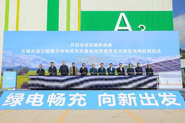 11月16日,云南高速公路重卡绿电超充走廊全线贯通暨兆瓦级超充网启用仪式在云南交投读书铺服务区举行。云南交投集团和华为数字能源的代表,以及客户、合作伙伴和行业专家参加仪式。该超充走廊项目由云南交投集团打造,覆盖川渝、桂粤等入滇核心通道及连接南亚、东南亚的跨境物流干线,建成了全国首张基于华为兆瓦超充解决方案面向电动重卡的高速公路绿色能源补给网络。项目一期全线部署基于华为超充技术的6座1.44兆瓦和22座600千瓦液冷重卡超充站,加速建设云南省干线高速服务区高效充电网络,构建高效便捷、开放兼容、广泛普惠的重卡补能基础设施网络。