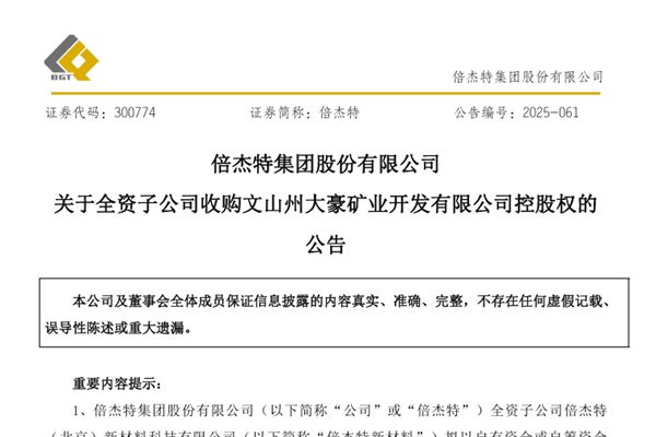 11月19日晚间,上市水处理企业倍杰特集团股份有限公司(简称:倍杰特)公告称,全资子公司倍杰特(北京)新材料科技有限公司(下称“倍杰特新材料”)拟以自有资金或自筹资金22,480.00万元收购汤玮、龙岩市小娘坑矿业有限公司(简称“小娘坑矿业”)、王育才合计持有的文山州大豪矿业开发有限公司(下称“大豪矿业”)55%股权。本次交易完成后,大豪矿业纳入公司合并报表范围。