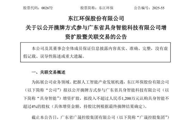 东江环保股份有限公司(简称:东江环保)公告称,为拓展公司业务领域、把握人工智能产业发展机遇,公司拟以公开摘牌方式参与广东省具身智能科技有限公司(下称“具身智能”)增资扩股,拟投入不超过人民币1,200万元认购具身智能不超过4%的股权(具体增资金额、持股比例根据最终摘牌结果确定)。
