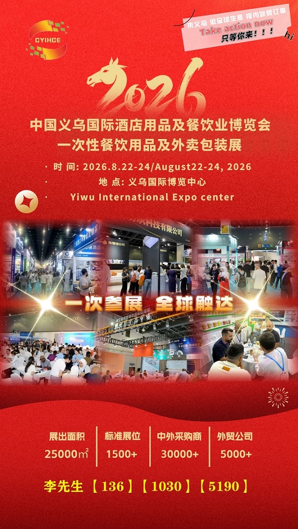 2026中国义乌国际酒店用品及餐饮业博览会将于8月22-24日在义乌国际博览中心盛大启幕!本届博览会依托义乌“世界超市”的全球贸易优势,特设“一次性餐饮用品与外卖包装展区”,专为全国餐饮包装生产商打造“接内外贸订单、拓全球市场”的高效平台,诚邀您携手参展,共享千亿商机!