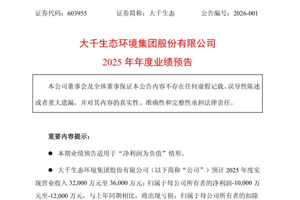 大千生态环境集团股份有限公司(简称:大千生态)近日发布《2025年年度业绩预告》,报告期内,大千生态预计实现营业收入32,000万元至36,000万元;归属于母公司所有者的净利润-10,000万元至-12,000 万元,与上年同期相比,将出现亏损;归属于母公司所有者的扣除非经常性损益后的净利润-10,500万元至-12,500万元。