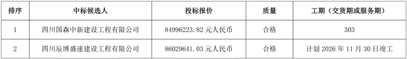 中标候选人第一名:四川国森中新建设工程有限公司,投标报价:84996223.82元;