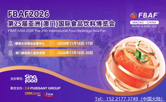 FBAF2026第25届亚洲(澳门)国际食品饮料博览会——将于2026年11月16-20日,以横琴+澳门双城联展模式启幕,FBAF2026汇聚琳琅满目的风味美食、前沿创新技术与新颖烹饪理念,于欢乐汇聚之地重新联结亚洲餐饮业界人士。展会涵盖多元细分领域,配套专家主导的现场活动,为海内外行业参与者搭建 平台,助力其在全球市场复苏浪潮中抢占行业先机。