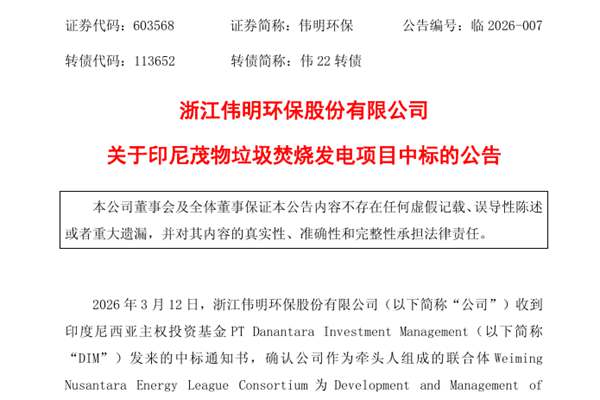 浙江伟明环保股份有限公司(简称:伟明环保)公告称,3月12日,公司收到了印度尼西亚主权投资基金PT Danantara Investment Management(以下简称“DIM”)发来的中标通知书,确认公司作为牵头人组成的联合体WeimingNusantara Energy League Consortium 为 Development and Management of Environmentally Friendly Technology-Based Waste Processing into Electricity (BUPP PSEL) in Greater Bogor(以下简称“本项目”或“茂物项目”)的中标单位。