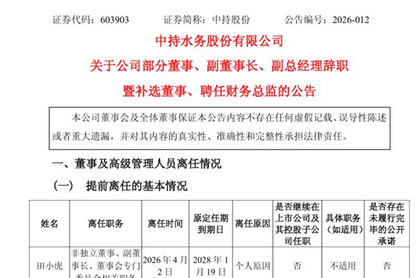 中持水务股份有限公司(简称:中持股份)公告称,近日公司收到非独立董事、副董事长田小虎先生和非独立董事张俊先生、陈亚松先生、高志永先生、喻正昕先生以及独立董事周运兰女士、项焱女士的辞职报告,具体情况如下: