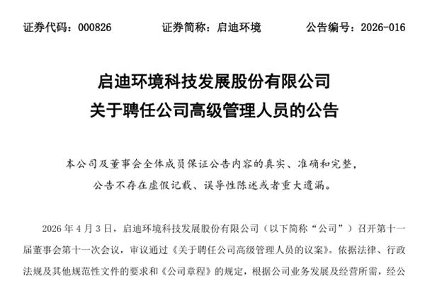 启迪环境科技发展股份有限公司(简称:启迪环境)近日公告称,根据公司业务发展及经营所需,经公司总经理提名,董事会提名委员会资格审核,董事会同意聘任刘忠诚先生为公司副总经理。任期自董事会审议通过之日起至公司第十一届董事会任期届满止。