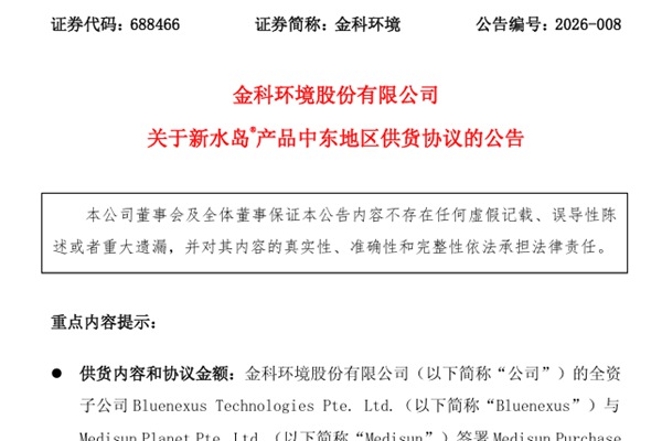 金科环境股份有限公司(简称:金科环境)近日公告称,公司全资子公司Bluenexus Technologies Pte. Ltd.(以下简称“Bluenexus”)与 Medisun Planet Pte. Ltd.(以下简称“Medisun”)签署Medisun Purchase Agreement(即新水岛®供货协议,以下简称“《供货协议》”或“本协议”),Bluenexus 向 Medisun 供应 4 套新水岛®智能净水装备等设备,并提供现场组装指导、测试支持、性能验收支持、培训及质保期服务等。项目实施地点为中东地区,协议金额为1,510万美元。