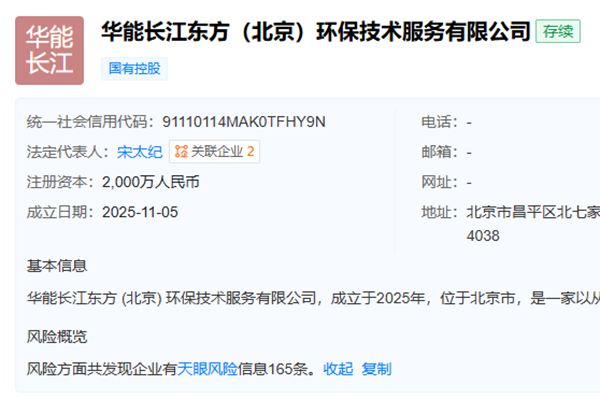 天眼查资料显示,近日,华能长江东方(北京)环保技术服务有限公司成立,法定代表人为宋太纪,注册资本为2000万元,经营范围包含: 【一般项目】技术服务、技术开发、技术咨询、技术交流、技术转让、技术推广;工程和技术研究和试验发展;工程技术服务(规划管理、勘察、设计、监理除外);工业工程设计服务;工程管理服务;水环境污染防治服务;水污染治理;固体废物治理;新型催化材料及助剂销售;环保咨询服务;新材
