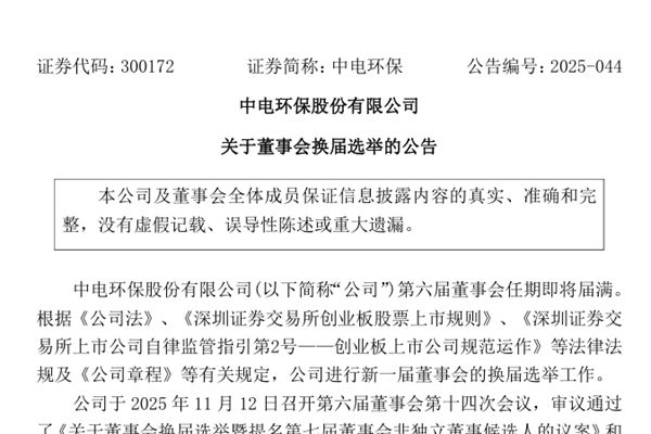 中电环保股份有限公司(简称:中电环保)于2025年11月9日召开第六届董事会第十四次会议,审议通过《关于董事会换届选举暨提名第七届董事会非独立董事候选人的议案》、《关于董事会换届选举暨提名第七届董事会独立董事候选人的议案》、《关于召开2025年第二次临时股东会的议案》等。 根据《公司章程》的规定,中电环保第七届董事会由8名董事组成,其中,非独立董事5名,独立董事3名。董事会同意提名王政福先生
