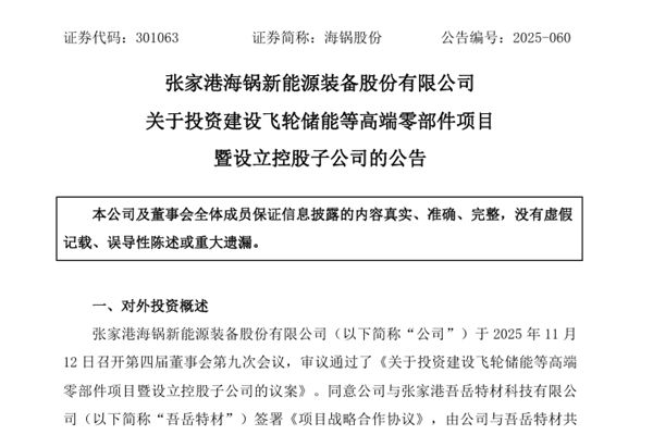 张家港海锅新能源装备股份有限公司(简称:海锅股份)公告称,公司于2025年11月12日召开第四届董事会第九次会议,审议通过了《关于投资建设飞轮储能等高端零部件项目暨设立控股子公司的议案》: 同意公司与张家港吾岳特材科技有限公司(下称“吾岳特材”)签署《项目战略合作协议》,由公司与吾岳特材共同出资设立控股子公司苏州迈格泰高端装备有限公司(暂定名,最终以市场监督管理局核准