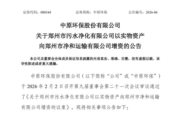 中原环保股份有限公司(简称:中原环保)公告称,为优化公司资源配置,提高资产使用效率,提升专业化运营水平,公司全资子公司郑州市污水净化有限公司(下称“净化公司”)拟将下属郑州新区污水处理厂(二期)及南曹污水处理厂共17辆污泥运输车辆,以实物资产作价出资的方式增资至净化公司全资子公司郑州市净和运输有限公司(下称“净和运输公司”)。 根据中联资产评估