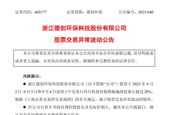 2025年9月2日、9月3日和9月4日连续3个交易日内,浙江德创环保科技股份有限公司(简称:德创环保)日收盘价格跌幅偏离值累计超过20%。对此,德创环保再次披露《股票交易异常波动公告》,明确经公司自查并书面问询控股股东及实际控制人,截至本公告披露日,确认不存在应披露而未披露的重大信息。而且,公司目前经营情况正常,基本面未发生重大变化,...
