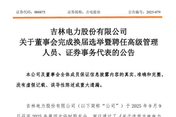 吉林电力股份有限公司(简称:吉电股份)公告称,公司于9月9日选举组成了第十届董事会,9月10日选举董事长、战略与投资委员会委员及主任委员、审计委员会委员及主任委员、提名委员会委员及主任委员、薪酬与考核委员会委员及主任委员、可持续发展(ESG)委员会委员及主任委员等,并聘任高级管理人员、证券事务代表。详情如下↓ 一、第十届董...