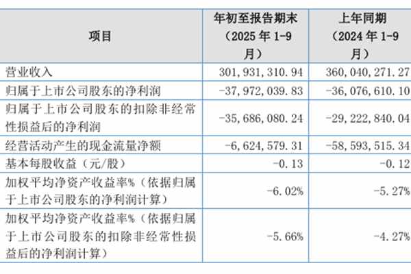 新安洁智能环境技术服务股份有限公司(简称:新安洁)近日发布《2025年三季度报告》。2025年前三季度,新安洁实现营业收入为3.02亿元,同比下降16.14%;归母净利润为-3797.20万元,同比下降5.25%;扣非归母净利润为-3568.61万元,同比下降22.12%;基本每股收益-0.13元。图源:新安洁公告 资料显示,新安洁...