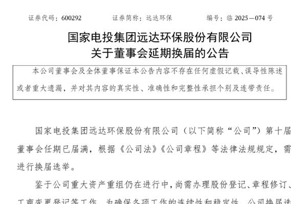 国家电投集团远达环保股份有限公司(简称:远达环保)近日公告称,公司第十届董事会任期已届满,鉴于公司重大资产重组仍在进行中,尚需办理股份登记、章程修订、工商变更登记等工作。为确保各项工作的连续性和稳定性,公司换届选举工作将适当延期,在换届选举工作完成之前,公司第十届董事会及其专门委员会成员、公司高级管理人员将严格按照相关法律法规和《公司...