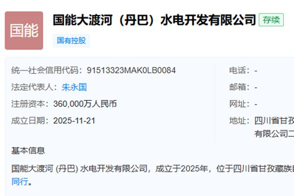 近日,国能大渡河(丹巴)水电开发有限公司成立,法定代表人为朱永国,注册资本36亿人民币,经营范围: 【许可项目】水力发电;发电业务、输电业务、供(配)电业务;建设工程施工;输电、供电、受电电力设施的安装、维修和试验。(依法须经批准的项目,经相关部门批准后方可开展经营活动,具体经营项目以相关部门批准文件或许可证件为准) 【一般项目】...