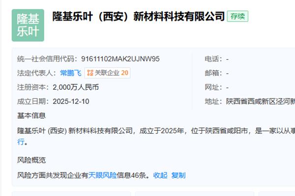 据天眼查,近日,隆基乐叶(西安)新材料科技有限公司正式成立,注册资本2000万元,经营如下↓ 一般项目:新材料技术推广服务;新材料技术研发;电子专用材料制造;金属表面处理及热处理加工;光伏设备及元器件制造;光伏设备及元器件销售;电池制造;电子专用材料研发;半导体器件专用设备制造;电子元器件与机电组件设备销售;电力电子元器件...