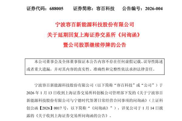 1月13日,就在刚刚披露与宁德时代新能源科技股份有限公司(下称“宁德时代”)签订了一份总销售金额预计超过1200亿元的《磷酸铁锂正极材料采购合作协议》后,宁波容百新能源科技股份有限公司(简称:容百科技)收到上海证券交易所科创板公司管理部下发的上证科创公函【2026】0017 号《关于宁波容百新能源科技股份有限公...