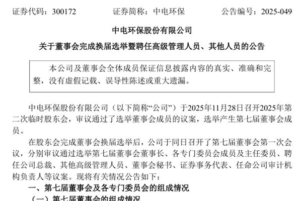 中电环保股份有限公司(简称:中电环保)公告称,公司于2025年11月28日召开2025年第二次临时股东会,审议通过了选举董事会成员的议案,选举产生第七届董事会成员。同日,公司召开了第七届董事会第一次会议,分别审议通过选举第七届董事会董事长、各专门委员会成员及主任委员、聘任公司总裁、其他高级管理人员、董事会秘书、证券事务代表、任命公司审计机构负责人等议案。 详情如下↓ 一、第七届董
