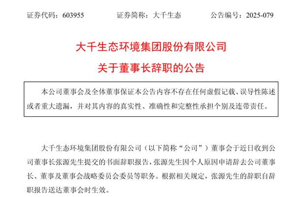 大千生态环境集团股份有限公司(简称:大千生态)公告称,公司董事会近日收到了董事长张源先生提交的书面辞职报告,张源先生因个人原因申请辞去公司董事长、董事及董事会战略委员会委员等职务。根据相关规定,张源先生的辞职自辞职报告送达董事会时生效。图源:大千生态公告 根据《公司章程》,大千生态将由副董事长段力平先生代为履行董事长职责,代行职责的期限自张源先生辞职之日起至董事会选举产生新任董事长之日止。公