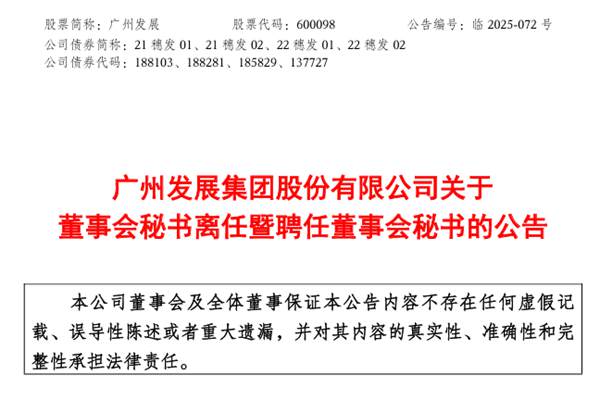 广州发展集团股份有限公司(简称:广州发展)近日公告称,因工作调整,吴宏申请辞去董事会秘书职务,将继续在公司担任党委副书记、副董事长、总经理。吴宏未持有公司股份,不存在应当履行而未履行的承诺,其所负责的工作已妥善交接,其职务变动不会对公司正常经营活动产生不利影响。图源:广州发展公告 广州发展于2025年10月30日召开第九届董事会第十...