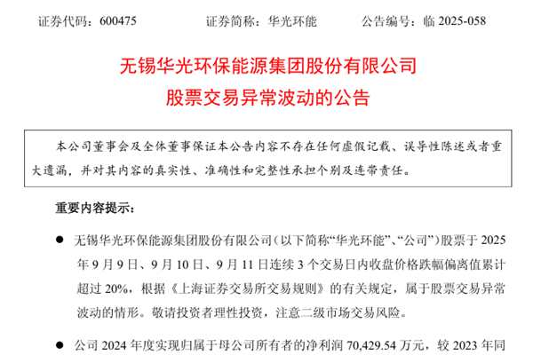 2025年9月9日、9月10日、9月11日连续3个交易日内,无锡华光环保能源集团股份有限公司(简称:华光环能)收盘价格跌幅偏离值累计超过20%,根据《上海证券交易所交易规则》的有关规定,属于股票交易异常波动的情形。因此,华光环能于9月12日早间发布了《股票交易异常波动的公告》。 华光环能表示,公司2024年度实现归属于母公司所有者的...