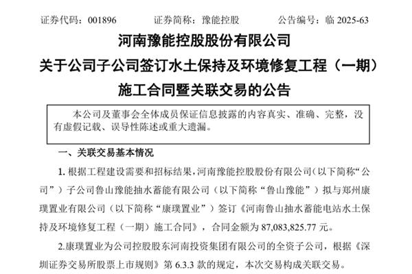 河南豫能控股股份有限公司(简称:豫能控股)近日公告称,根据工程建设需要和招标结果,公司子公司鲁山豫能抽水蓄能有限公司(下称“鲁山豫能”)拟与郑州康璞置业有限公司(下称“康璞置业”)签订《河南鲁山抽水蓄能电站水土保持及环境修复工程(一期)施工合同》,合同金额为87,083,825.77元。...