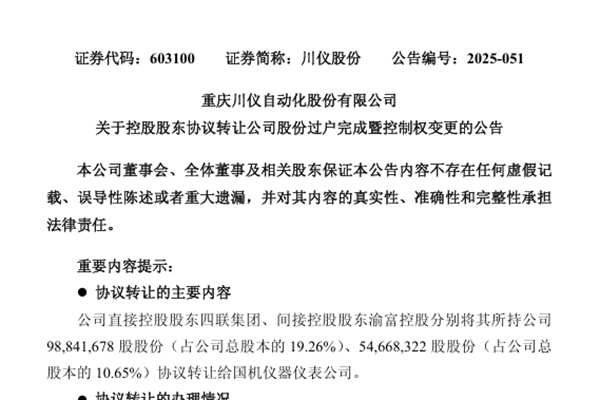 11月17日,重庆川仪自动化股份有限公司(简称:川仪股份)公告,截至本公告披露日,国机仪器仪表公司已按照与四联集团、渝富控股签署的股份转让相关协议约定,完成全部股份转让款的支付,其中支付至四联集团的股份转让款为2,392,584,200元,支付至渝富控股的股份转让款为1,323,313,800元。 本次协议转让已取得上海证券交易所的...
