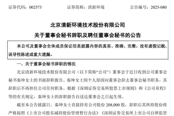 北京清新环境技术股份有限公司(简称:清新环境)公告称,董事会于近日收到公司董事会秘书秦坤女士的书面辞职报告。秦坤女士因个人原因向董事会辞去董事会秘书职务,其辞职后不再担任公司任何职务。经董事长提名,董事会提名委员会资格审核通过,聘任张子杰先生为公司董事会秘书,任期与公司第六届董事会一致。 张子杰先生,出生于1987年6月,中共党员,...