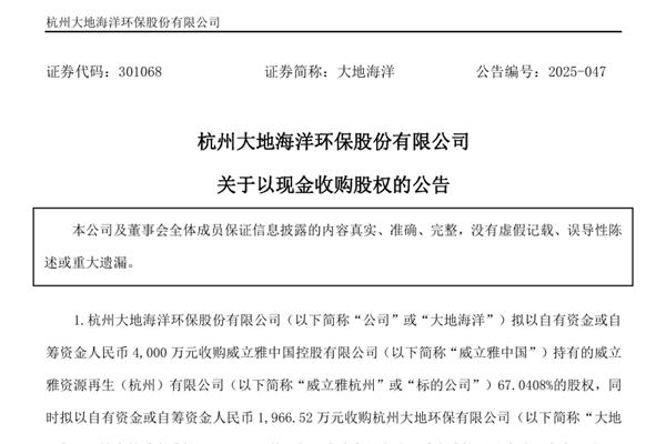 杭州大地海洋环保股份有限公司(简称:大地海洋)近日公告称,公司拟以自有资金或自筹资金人民币4,000万元收购威立雅中国控股有限公司(下称“威立雅中国”)持有的威立雅资源再生(杭州)有限公司(下称“威立雅杭州”)67.0408%的股权,同时拟以自有资金或自筹资金人民币1,966.52万元收...