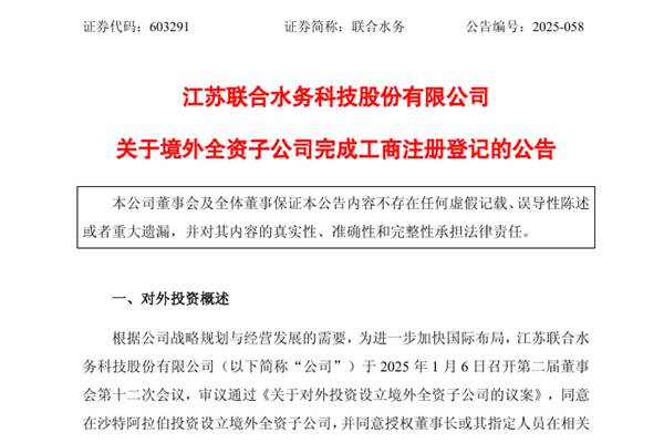 江苏联合水务科技股份有限公司(简称:联合水务)公告称,近日,公司完成沙特子公司注册登记手续,并取得沙特商务部(MinistryofCommerce)颁发的公司注册证书及商业登记证,相关注册登记信息如下: 中文名称:联合水务沙特公司 英文名称:UnitedWaterService Company 注册资本:50,000沙特里亚尔 ...