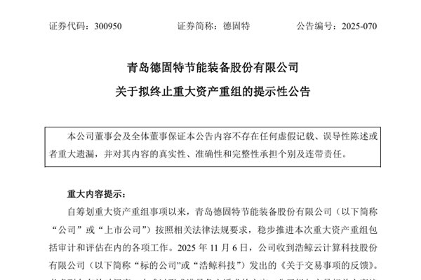 青岛德固特节能装备股份有限公司(简称:德固特)公告称,11月6日,公司收到浩鲸云计算科技股份有限公司(下称“浩鲸科技”)发出的《关于交易事项的反馈》。考虑到在有效时间窗口内难以形成满足各方诉求的方案,公司拟与交易相关方商议终止本次重大资产重组交易。公司与交易相关方尚需就上述终止事项在进一步洽谈协商的基础上达成最...