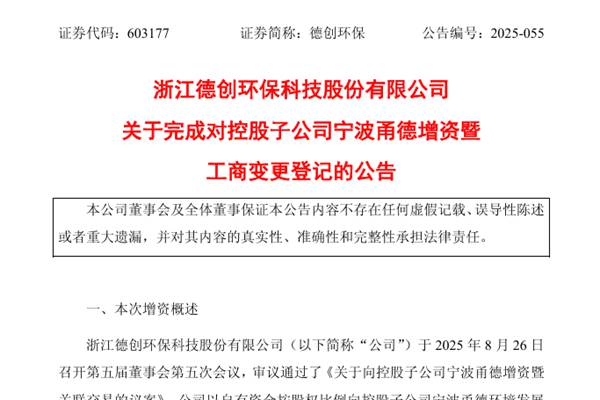 浙江德创环保科技股份有限公司(简称:德创环保)公告称,公司向控股子公司宁波甬德环境发展有限公司(下称“宁波甬德”)增资40,584,000元事项已完成。截至目前,宁波甬德完成工商变更登记备案手续,并取得了宁波市鄞州区市场监督管理局换发的《营业执照》。 本次增资完成后,宁波甬德注册资本由8000万元增加到147...
