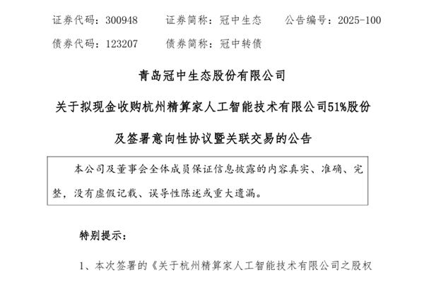 青岛冠中生态股份有限公司(简称:冠中生态)近日公告称,公司与杭州精算家人工智能技术有限公司(下称“杭州精算家”)的11名股东签署了《意向协议》,拟以支付现金的方式收购杭州精算家51%的股权。本次收购的标的公司整体估值暂定为不高于56,000万元。 冠中生态表示,本次签订的意向协议系各方基于收购事项达成的初步一...