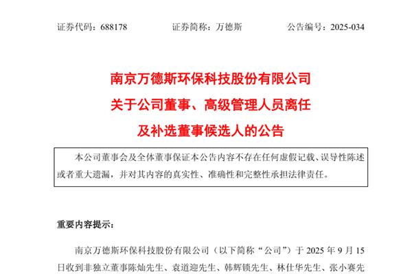 南京万德斯环保科技股份有限公司(简称:万德斯)公告称,公司近日收到非独立董事陈灿先生、袁道迎先生、韩辉锁先生、林仕华先生、张小赛先生、副总经理李春泉、财务总监张开圣的书面辞职报告。 陈灿先生因工作调整向公司董事会提出辞去公司第四届董事会战略委员会委员职务,但其仍在公司担任董事、总经理; 袁道迎先生因工作调整向公司董事会提出辞去公司...