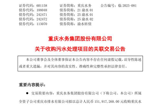 重庆水务集团股份有限公司(简称:重庆水务)近日公告称,全资子公司重庆市排水有限公司拟以总计人民币151,917,260.00元收购重庆水务环境控股集团有限公司(下称“重庆水务环境集团”)建设的井口污水处理厂三期扩建工程、土主污水处理厂提标改造工程的资产以及与其相关的债权债务。本次交易构成关联交易,不构成重大资产...