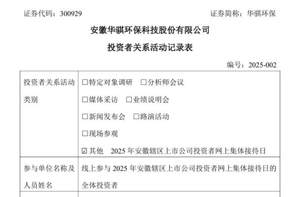 安徽华骐环保科技股份有限公司(简称:华骐环保)近日发布《投资者关系活动记录表》,答复投资者关于向特定对象定增事项进展、市值、债务追回、应收账款等相关问题。详情如下↓ 1、请问贵公司向特定对象定增的事进展如何? 回复:尊敬的投资者您好,公司以简易程序向特定对象发行股票相关事宜已按照相关规定进行了年度股东大会授权,授权期限为...