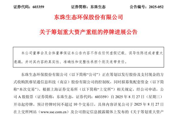 东珠生态环保股份有限公司(简称:东珠生态)近日公告称,公司正在筹划以发行股份及支付现金的方式收购凯睿星通信息科技(南京)股份有限公司(下称“凯睿星通”)的控制权,同时拟募集配套资金。根据上海证券交易所(下称“上交所”)相关规定,经公司申请,公司A股股票(证券简称:东珠生态)自2025年8...