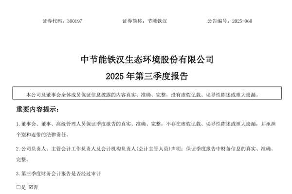 中节能铁汉生态环境股份有限公司(简称:节能铁汉)近日发布《2025年第三季度报告》。2025年前三季度,节能铁汉实现营业总收入6.06亿元,同比下降37.09%;归母净利润亏损8.78亿元,上年同期亏损6.33亿元;扣非净利润亏损8.55亿元,上年同期亏损6.03亿元;经营活动产生的现金流量净额为4648.86万元,上年同期为-3.4...
