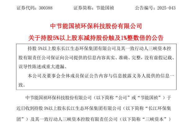 中节能国祯环保科技股份有限公司(简称:节能国祯)公告称,公司近日收到持股5%以上股东长江生态环保集团有限公司(下称“长江环保集团”)及其一致行动人三峡资本控股有限责任公司(下称“三峡资本”)出具的《关于减持中节能国祯环保科技股份有限公司股份触及1%整数倍的告知函》,2025年9月8日,三...