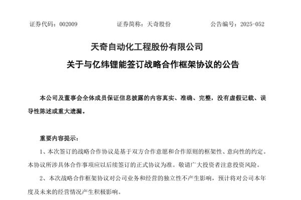 天奇自动化工程股份有限公司(简称:天奇股份)近日公告称,公司与惠州亿纬锂能股份有限公司(下称“亿纬锂能”)签署《战略合作框架协议》(以下简称“本协议”),双方拟共同构建锂电池“制造-应用-逆向回收-再生利用”全链条闭环体系,通过强化回收网络布局、高效分选与再生利用...