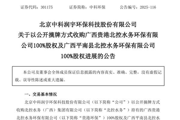 北京中科润宇环保科技股份有限公司(简称:中科环保)近日公告称,公司以公开摘牌方式收购了北控水务(广西)集团有限公司持有的广西贵港北控水务环保有限公司(下称“贵港环保”)100%股权及广西平南县北控水务环保有限公司(下称“平南环保”)100%股权。转让价格分别为人民币30,267.00万元...