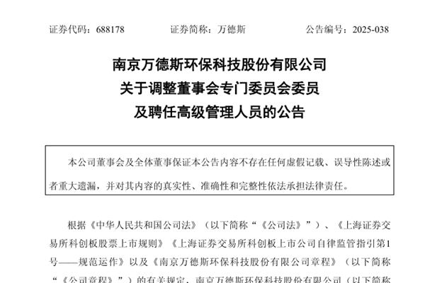 南京万德斯环保科技股份有限公司(简称:万德斯)公告称,10月9日,公司召开第四届董事会第九次会议审议通过了《关于调整董事会专门委员会委员的议案》《关于聘任公司高级管理人员的议案》,详情如下↓ 一、调整后董事会专门委员会委员情况 公司2025年第二次临时股东大会同意选举徐晖先生、温松英女士、汪衡慧先生、梅学奎先生为公司第四...