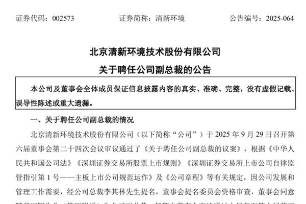 北京清新环境技术股份有限公司(简称:清新环境)近日公告称,因公司发展和管理工作需要,经公司总裁李其林先生提名,董事会提名委员会资格审查,董事会同意聘任田野先生为公司副总裁,任期自董事会审议通过之日起至第六届董事会任期届满之日止。 田野先生,出生于1986年10月,中共党员,党校研究生,高级经济师、中级工程师、二级建造师、法律职业资格...