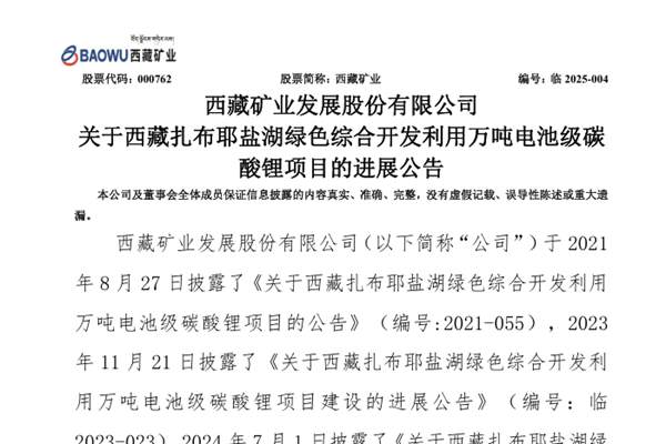 9月25日晚间,西藏矿业发展股份有限公司(简称:西藏矿业)公告称,西藏扎布耶盐湖绿色综合开发利用万吨电池级碳酸锂项目,于2025年9月20—24日顺利完成120小时的功能考核,标志着该项目正式投产。该项目属于大型工业装置,系全球首套采用膜分离+MVR盐湖提锂工艺的项目,涉及较为复杂的技术调试、环境适配和产品验证等,同时地处...