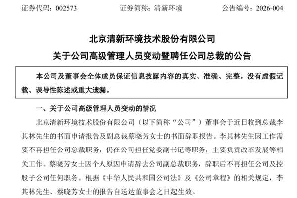 北京清新环境技术股份有限公司(简称:清新环境)公告称,公司于2026年1月16日召开第六届董事会第三十次会议,审议通过了《关于聘任公司总裁的议案》。经公司董事长提名,董事会提名委员会审核通过,聘任唐华应先生为公司总裁,任期自董事会审议通过之日起至第六届董事会任期届满之日止。 唐华应先生,出生于1968年5月,中国国籍,中共党员,硕士...