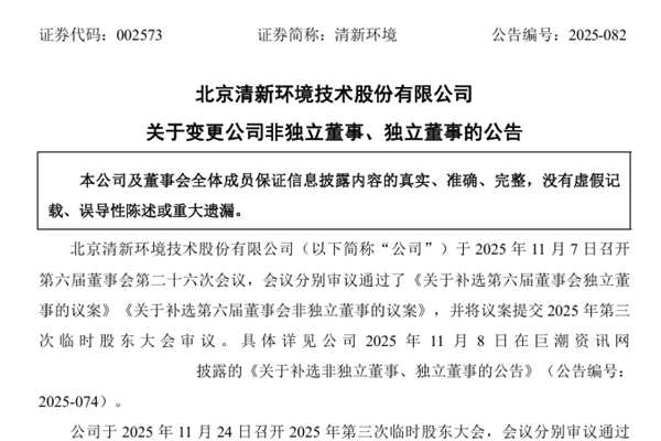 北京清新环境技术股份有限公司(简称:清新环境)公告称,公司于2025年11月24日召开2025年第三次临时股东大会,会议分别审议通过《关于补选第六届董事会独立董事的议案》《关于补选第六届董事会非独立董事的议案》,同意聘任王志轩先生、谢广明先生为公司第六届董事会独立董事,聘任唐鸿先生为公司第六届董事会非独立董事,任期自股东会审议通过之日...